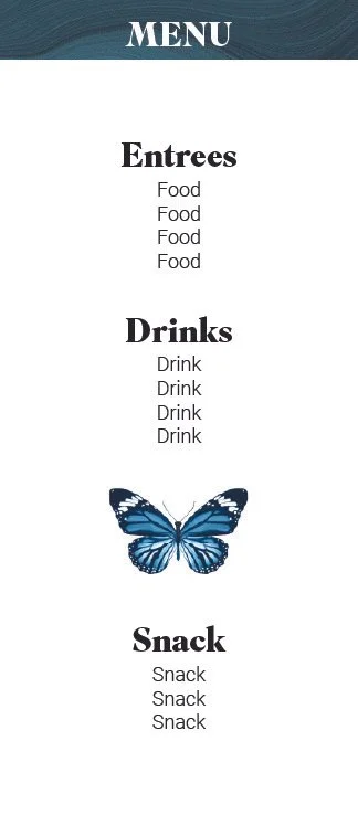There were a few Items I designed that did not end up being produced because they did not fit within the budget. Below are the initial designs for a Menu insert that would go inside the brochure, and a drink menu foam core.