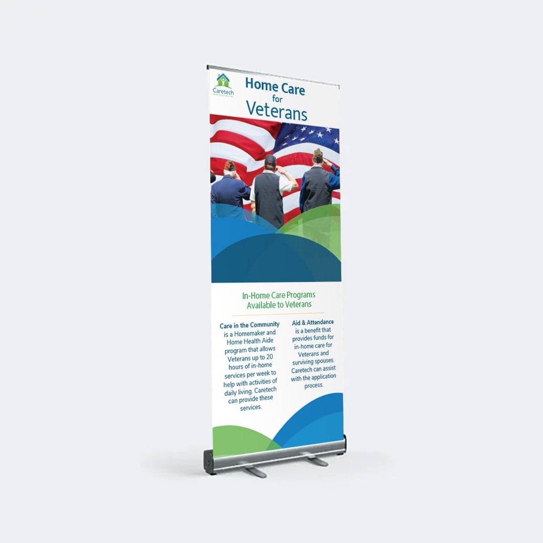 While Caretech helps out many people, not just Veterans, they wanted a banner they could bring with them to different events and locations that showcased their support for Veterans in the community. I designed a retractable banner for them as it would be something that could be easily stored and easily displayed. Making it the perfect option for any event they had in the future.